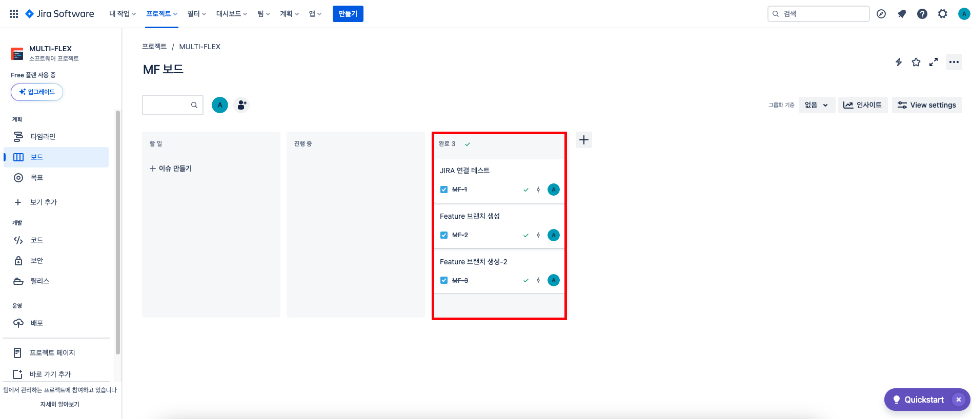 - JIRA 내에서 이슈들이 모두 ‘완료’된 상태입니다. 그렇기에 소스코드 내에서 하나의 소스로 합쳐지는 작업이 필요합니다.