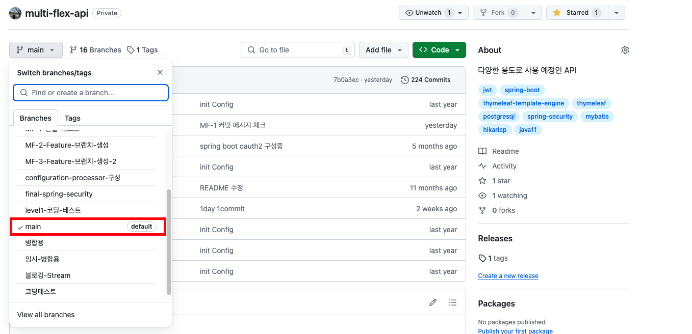 💡 Main 브랜치의 경우는 Github 내에 ‘default’ 브랜치를 의미합니다.