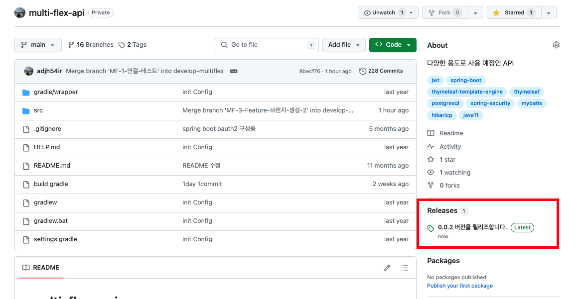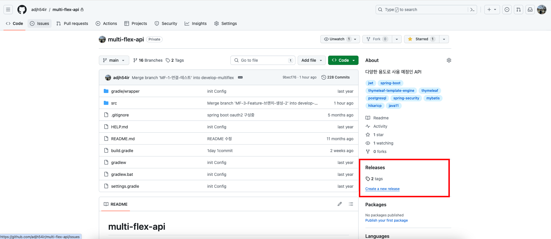 💡 위에서 추가한 태그는 Github의 Repository에서 릴리즈 버전을 구성할 수 있습니다.