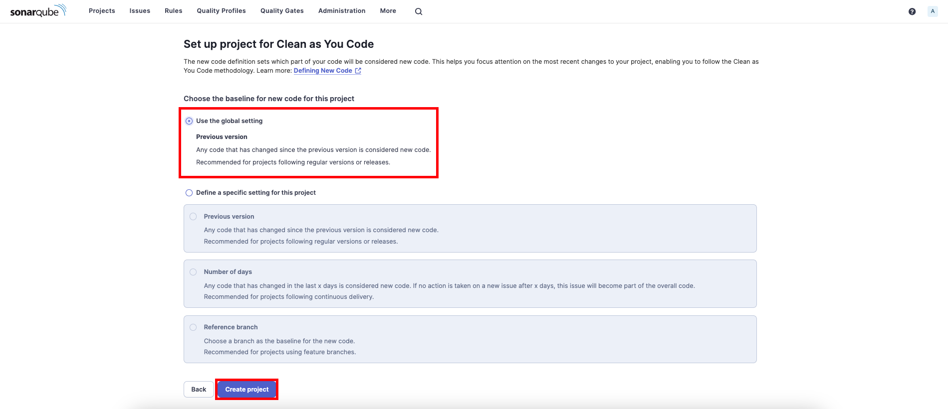 8. ‘Use the global setting’을 선택하고 ‘Create project’를 선택합니다.
