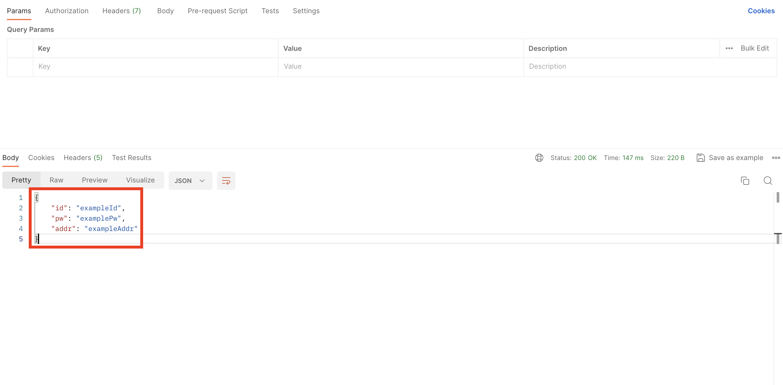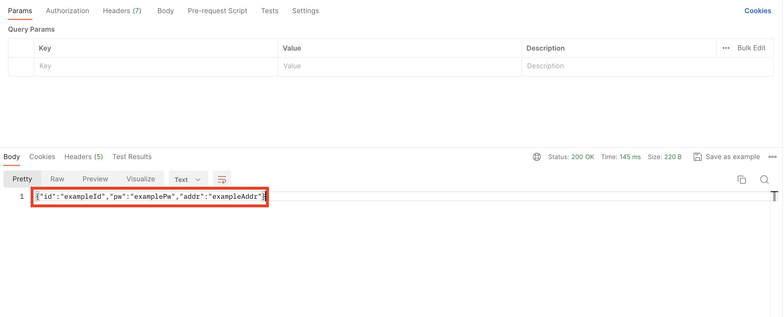 // 직렬화 :: {"id": "exampleId", "pw" : "examplePw", "addr" :"exampleAddr"}