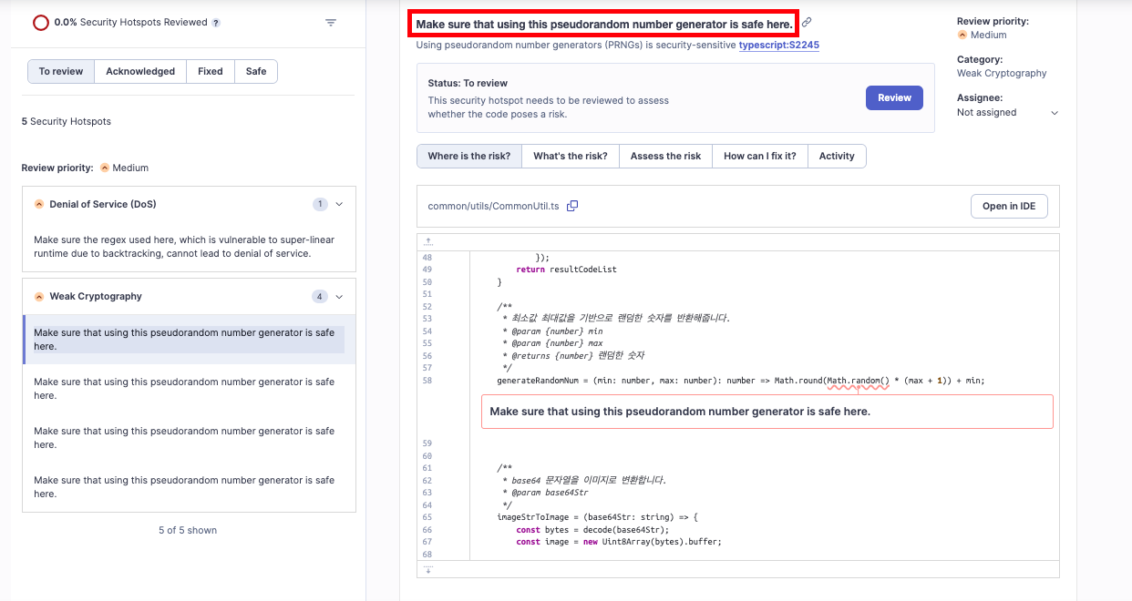 - SonarQube로 React-native를 수행하였을 때 Security Hotspots로 Math.random() 함수에서 아래와 같은 문제점이 발생하였습니다.