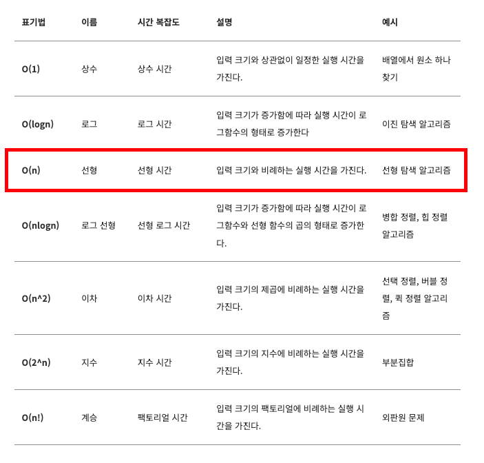 - 일반적으로 빅오 표기법을 이용하여 표기하였을때 O(N)입니다. 이는 배열이나 리스트 크기에 비례하여 알고리즘의 수행시간이 증가한다는 의미입니다.