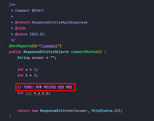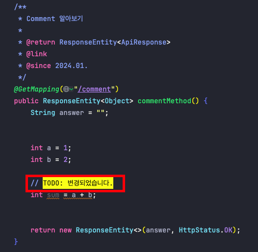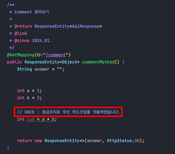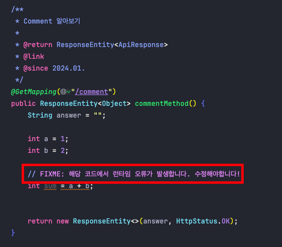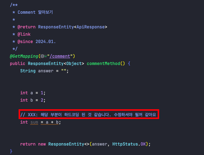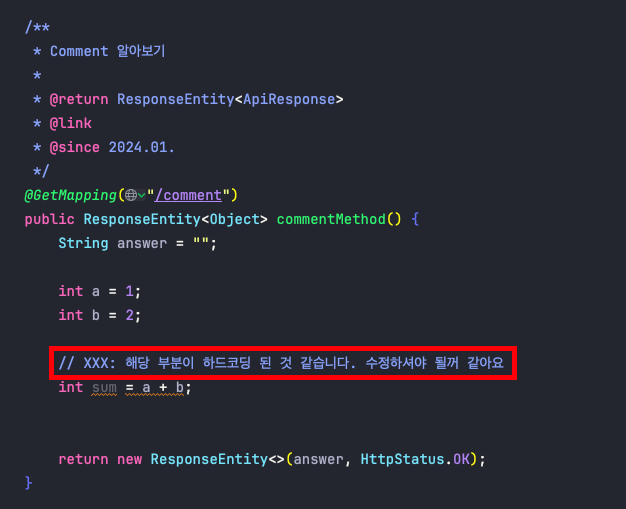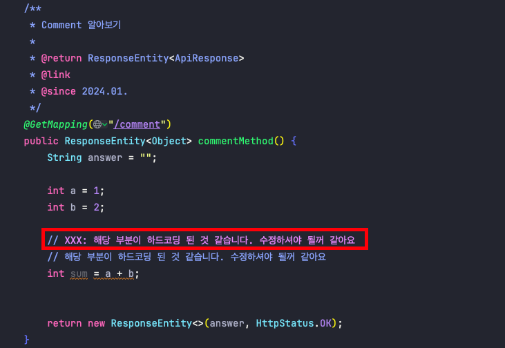 - XXX에 대한 커스텀 주석 태그를 추가하지 않아서 일반 주석과 구분이 되지 않습니다. 그렇기에 이를 구분하기 위해 커스텀 주석 태그를 추가해 줍니다.
