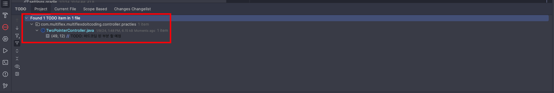 - IntelliJ 내에서 최초 제공하는 주석 태그는 TODO, FIXME에 대해 지원하고 있고, 커스텀으로 나만의 주석 태그를 만들 수 있습니다.