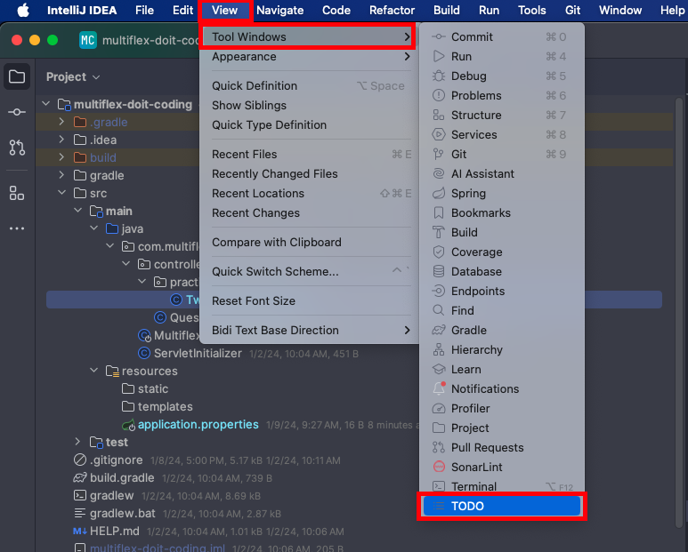 1. View 탭 - Tool Windows 탭 - TODO 메뉴를 선택해 줍니다.