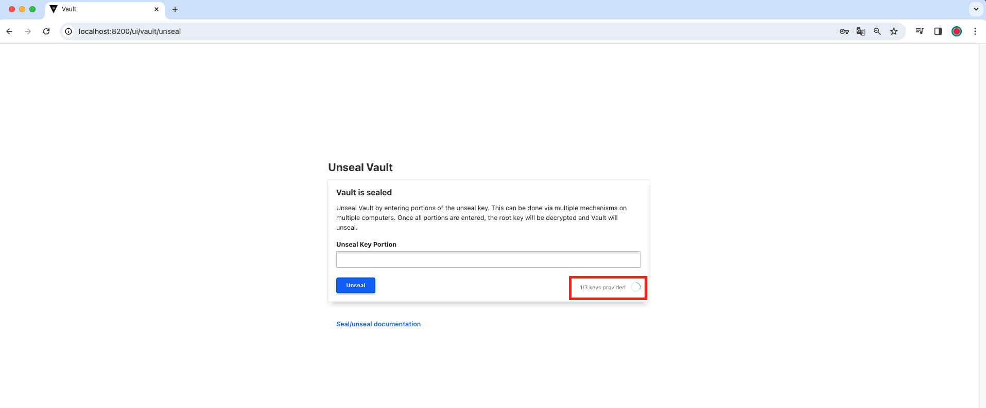 해당 글에서는 Docker에서 Unseal Vault 키를 잃어버린 경우 초기화 방법에 대해 알아봅니다. 1) 문제점 💡 아래와 같이 Unseal키를 입력하는 부분에서 문제점이 발생하였습니다. Unseal Vault by entering port