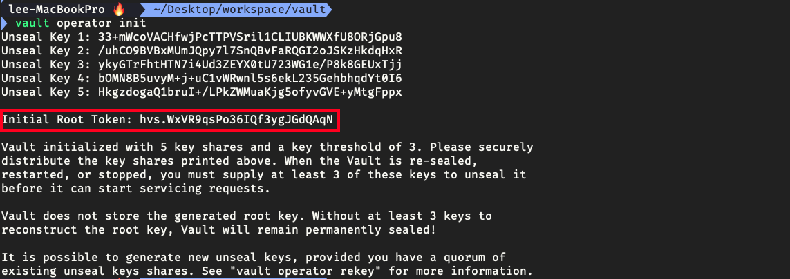 - 아래와 같이 Unseal Key 1, 2, 3, 4, 5와 Initial Root Token이 출력이 됩니다. 이를 잃어버리지 않고 꼭 가지고 계셔야 합니다. ⭐️⭐️⭐️⭐️⭐️⭐️⭐️⭐️