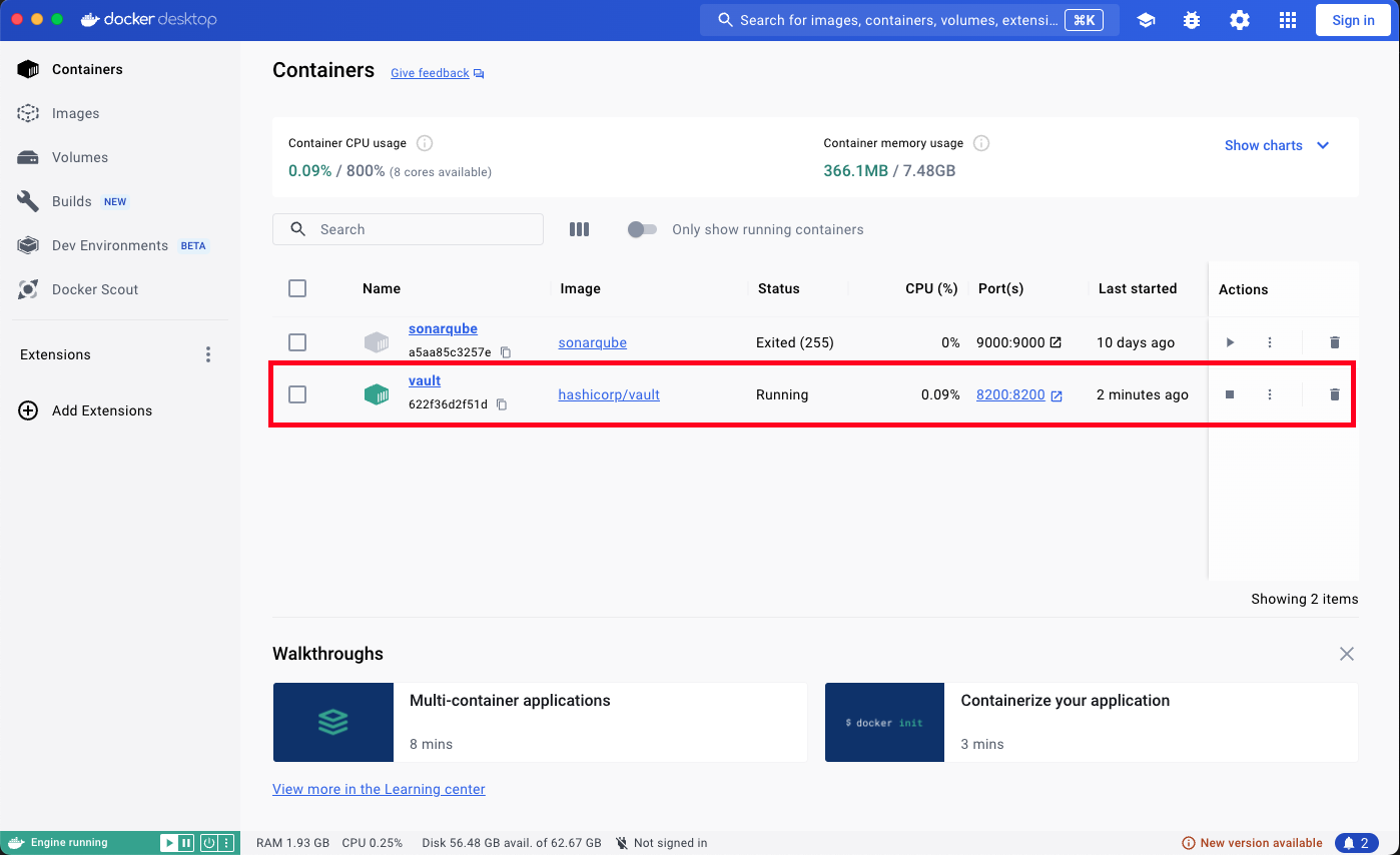 docker run --name vault -d --cap-add=IPC_LOCK -p 8200:8200 \