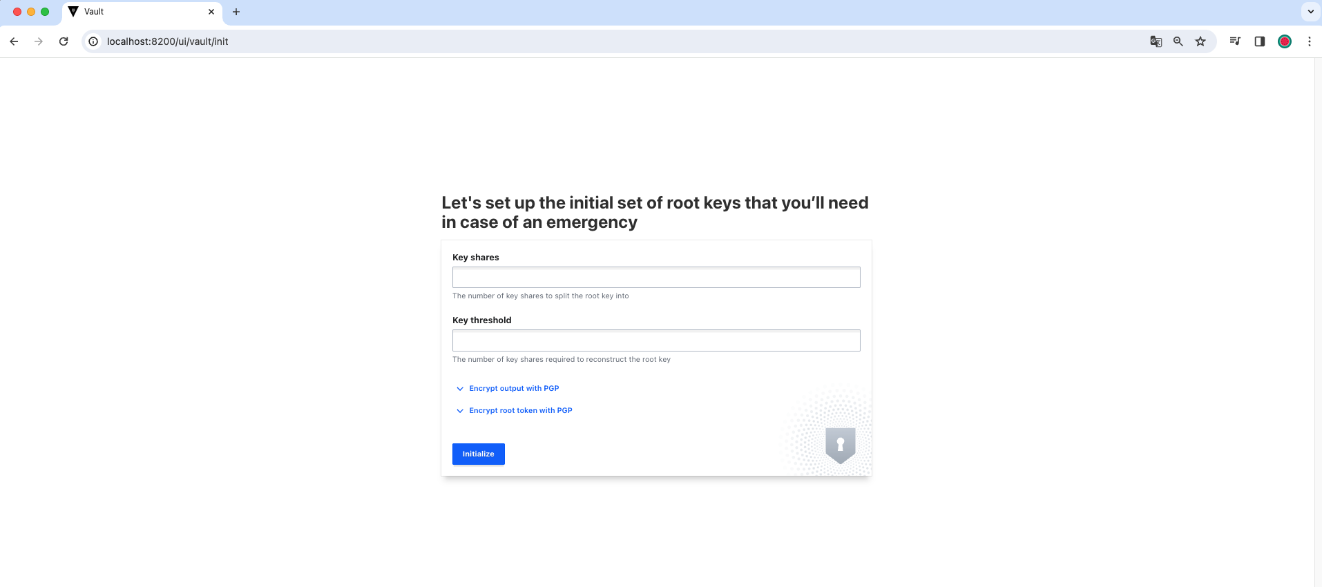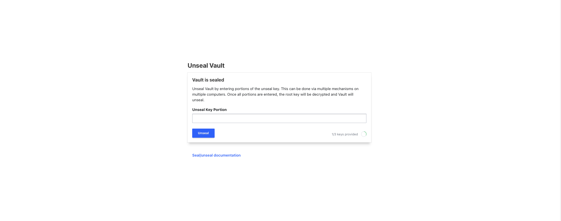 Unseal Vault by entering portions of the unseal key. This can be done via multiple mechanisms on multiple computers. Once all portions are entered, the root key will be decrypted and Vault will unseal.