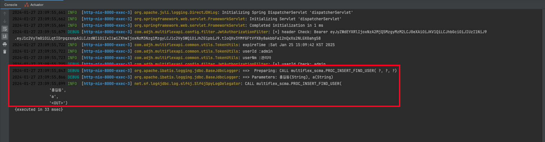 💡 UserServiceImpl - 해당 부분에서는 void 형태의 반환 값을 가지는 procInsertFindUser() 함수를 호출하고 return 값으로 dummyUserDto 내에 값이 반환됩니다. - 해당 반환된 값을 결과값으로 반환하도록 구성하였습니다.