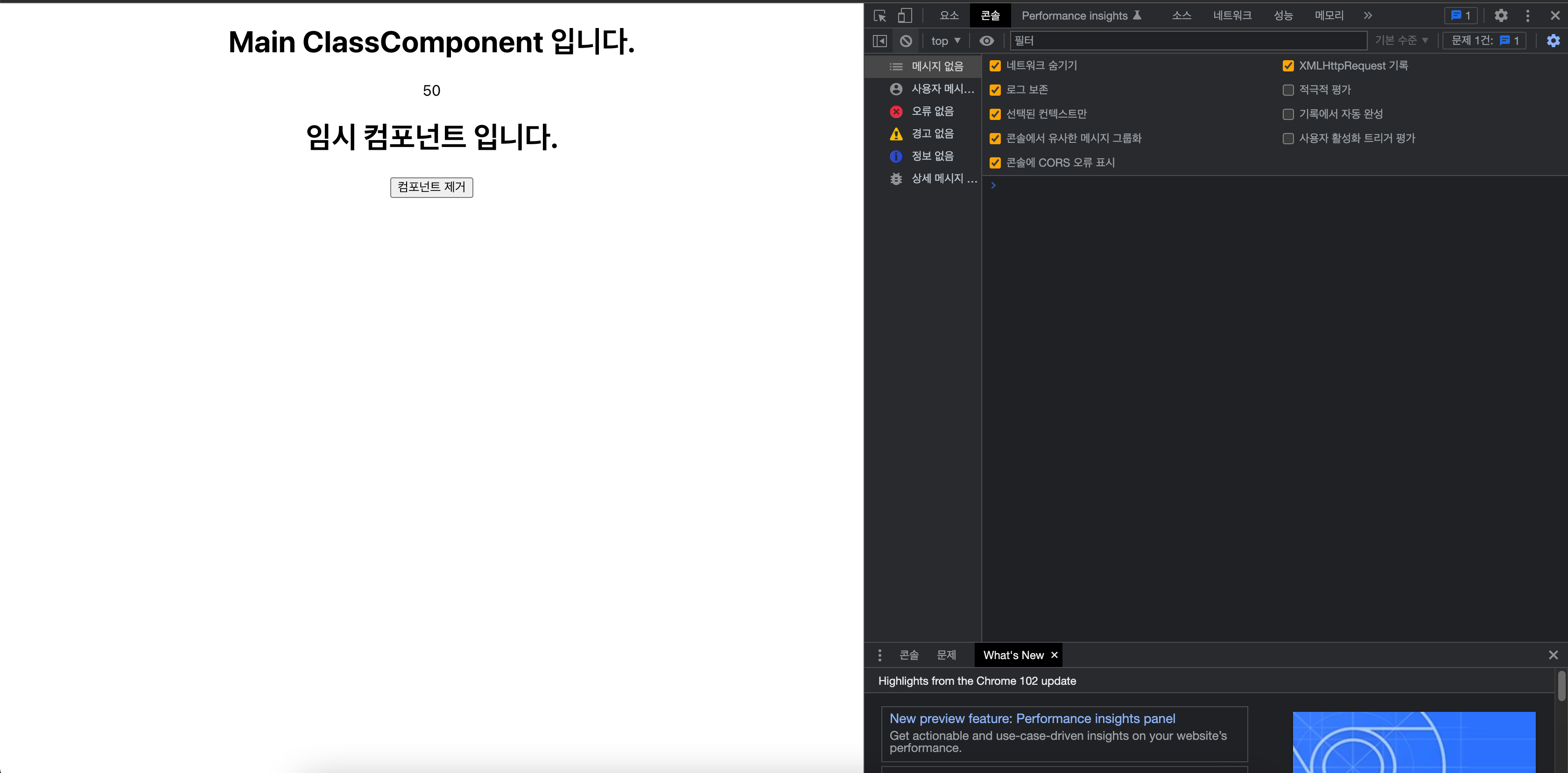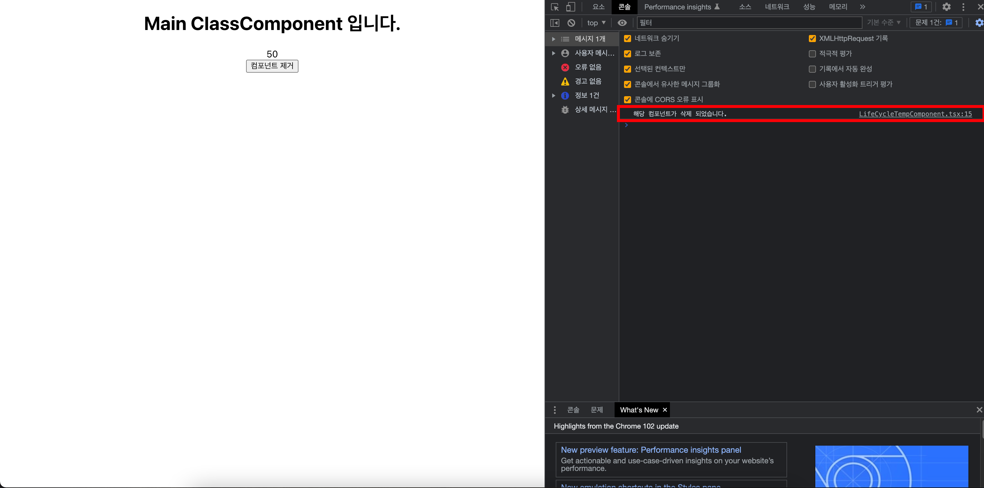 💡 버튼을 눌렀을 경우 해당 컴포넌트가 제외될 때, LifeCycleTempComponen 컴포넌트의 'componentWillUnmount()'가 수행되는 것을 확인할 수 있습니다.