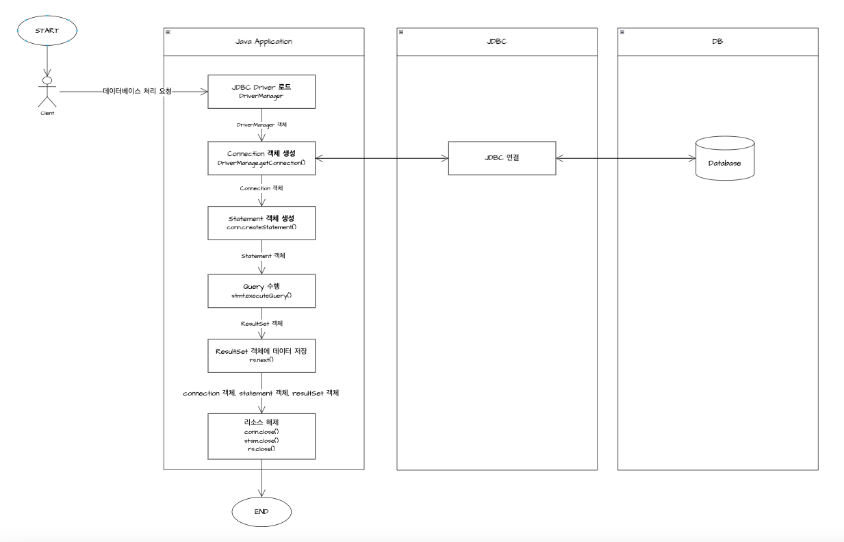 - Java Application - JDBC - DB 간에 처리되는 과정으로 자바 애플리케이션에서 데이터베이스에 접근하고 데이터를 처리하는 과정을 설명합니다. - 해당 처리과정은 클라이언트의 SQL 요청이 있을 때마다 아래의 과정을 수행하게 됩니다.