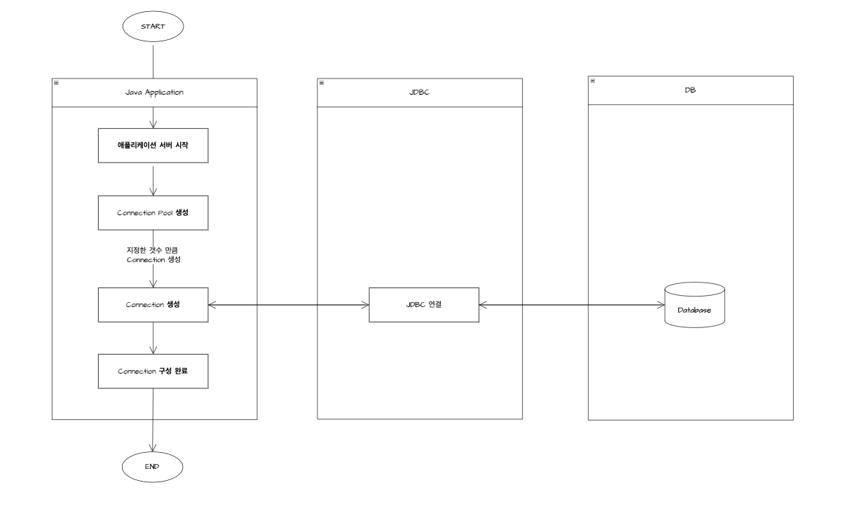 💡 최초 커넥션 풀 생성 1. 애플리케이션 서버 시작 - 웹 애플리케이션에서 서버가 실행되면 커넥션 풀이 생성 준비가 됩니다. (* 해당 과정에서 Connection 연결 개수를 사전에 지정합니다.)