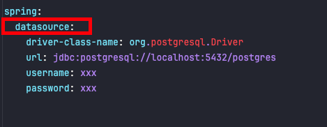 - driver-class-name: 데이터베이스 연결을 위한 JDBC 드라이버 클래스를 지정합니다. - url: 연결하려는 데이터베이스의 URL을 지정합니다. - username: 데이터베이스 접속을 위한 사용자 이름을 입력합니다. - password: 데이터베이스 접속을 위한 사용자 비밀번호를 입력합니다.