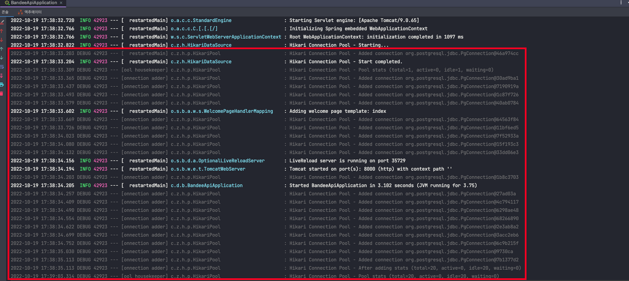 💡 Application Server - 아래와 같이 Application Server가 실행될 때 DBCP인 HikariCP가 수행되어 Connection Pool이 생성됨을 확인하였습니다.