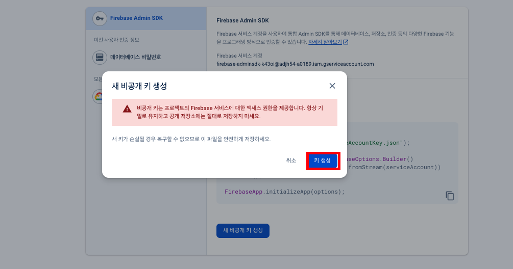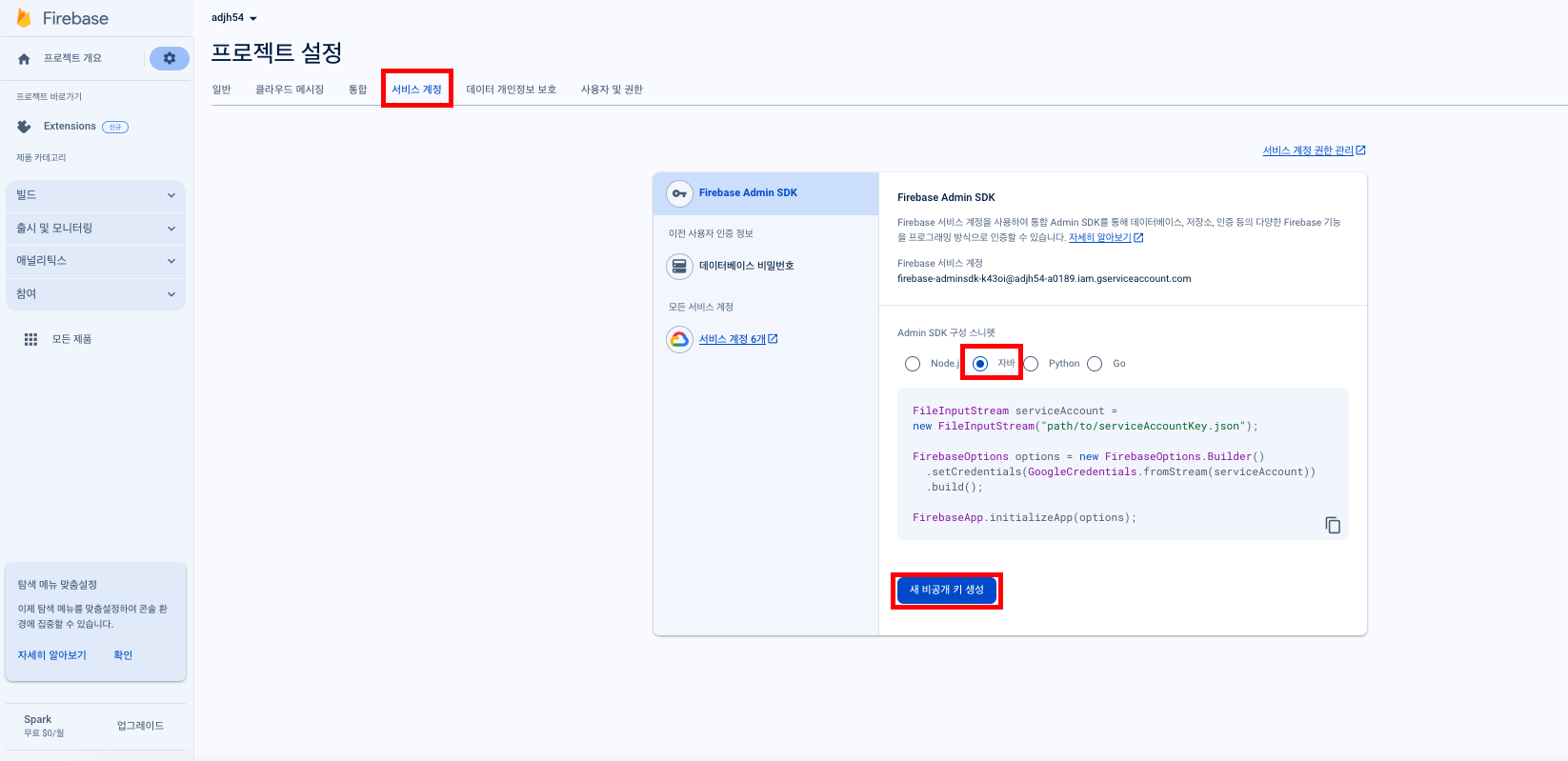 2. 프로젝트 설정 → 서비스 계정 → 자바 선택 → ‘새 비공개 키 생성’ 버튼을 누릅니다.