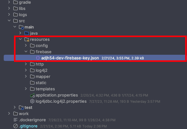 4. 생성된 json 파일을 프로젝트 resources/firebase 디렉터리를 생성하고 경로에 옮겨둡니다.