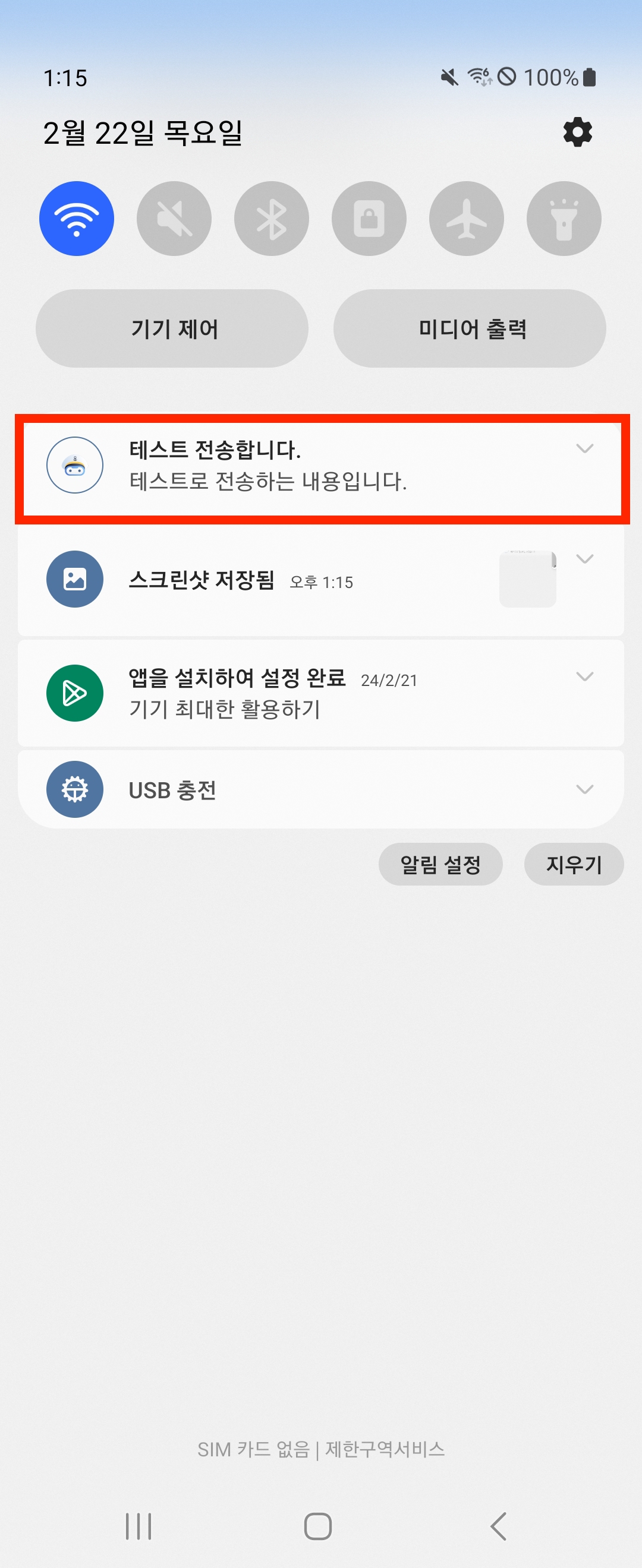 - 요청을 하여 결과로 성공 시 값으로 1을 반환받으면 푸시 메시지가 전송 완료됨을 확인할 수 있습니다.