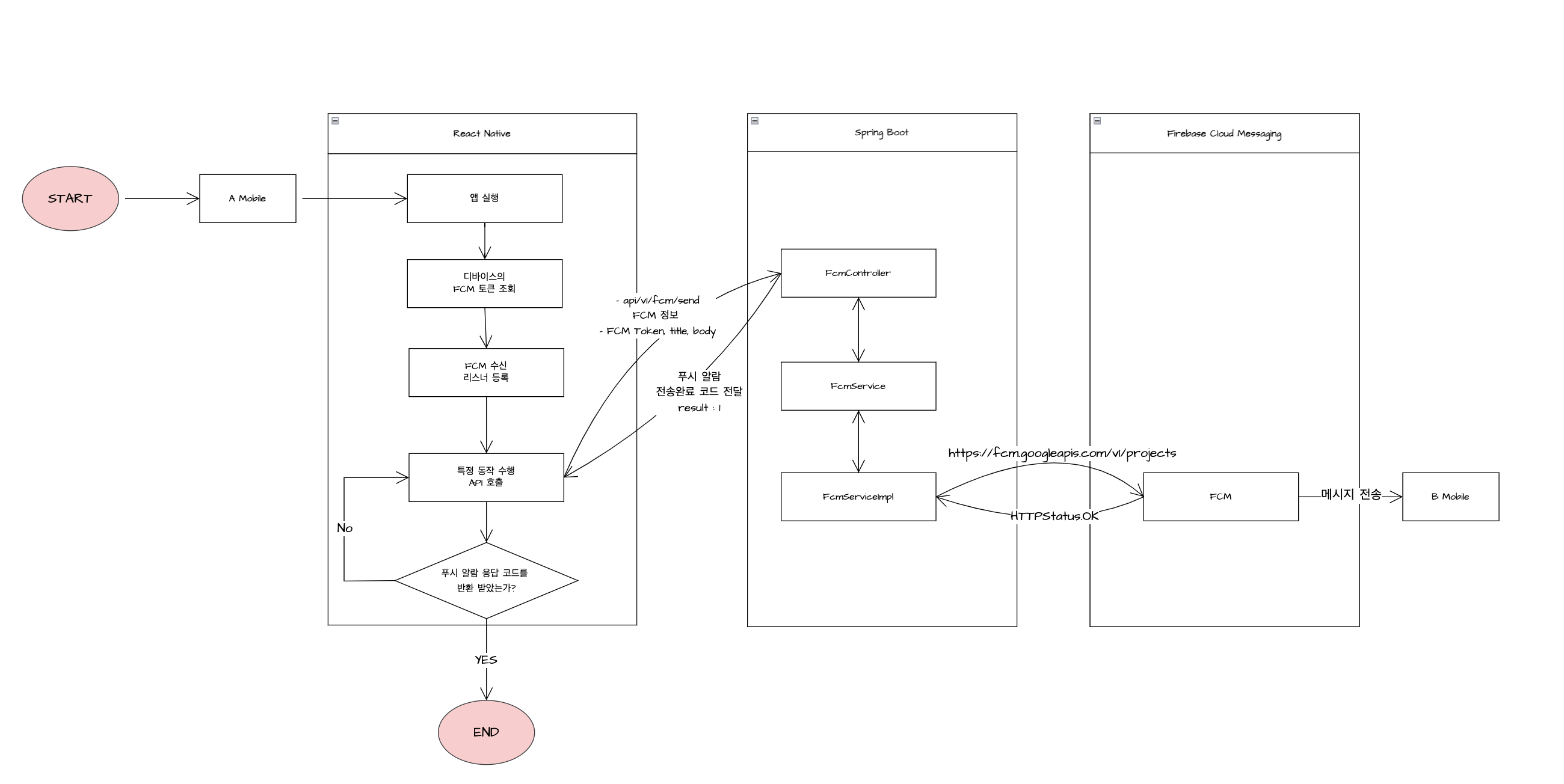 - React Native, Spring Boot 개발 환경에서 FCM과 통신하여 메시지를 전송하고 응답 결과를 반환받는 구조로 환경이 구성되어 있습니다.