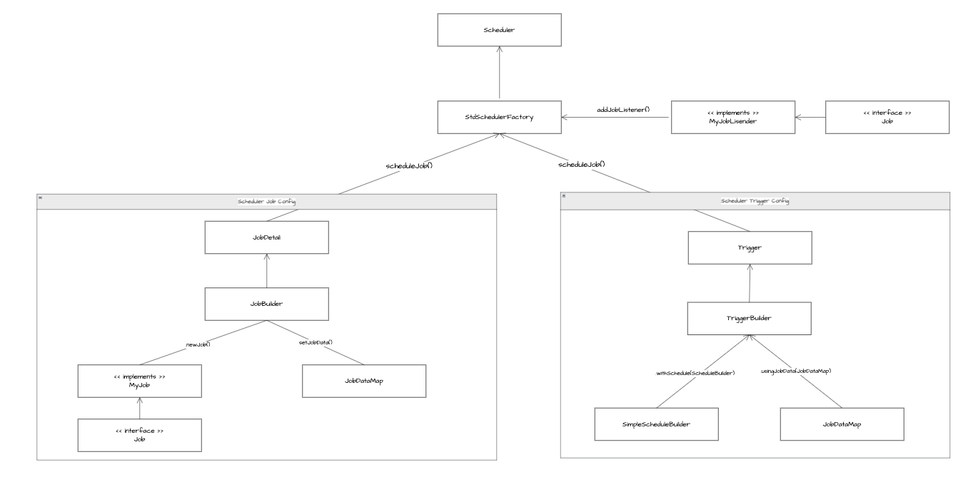 💡 Scheduler - 스케줄러에서 사용되는 Scheduler는 StdSchedulerFactory를 통해 스케줄러를 가져와서 Scheduler Job을 구성합니다. 또한 Job의 생명주기를 관리하는 JobListener를 등록할 수 있습니다. - Scheduler Job에는 Job과 Trigger가 등록이 됩니다.