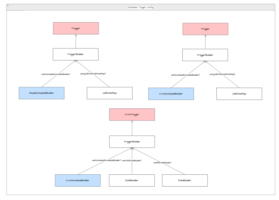 TriggerBuilder는 SimpleTriggerBuilder와 CronTriggerBuilder 같은 여러 하위 클래스를 가지고 있습니다 1. SimpleTriggerBuilder - 트리거가 특정 시간에 시작하여 일정한 간격으로 반복 실행되도록 설정할 수 있습니다 2. CronTriggerBuilder - 복잡한 스케줄 패턴을 정의할 수 있습니다.
