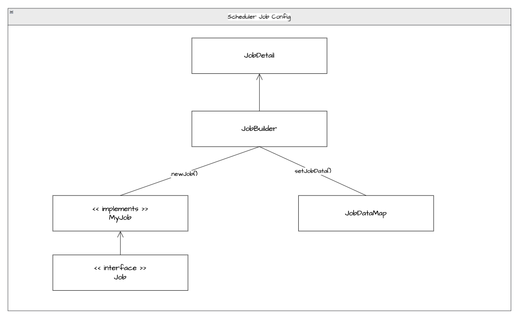 - 스케줄러에서 사용되는 Job은 JobDetail 객체를 구성하기 위해 JobBuilder로 구성하며, 해당 JobBuilder에는 Job의 인터페이스를 MyJob이라는 클래스에서 구현체로 ‘수행해야 하는 작업’을 작성하여 Builder를 구성하여 사용합니다.