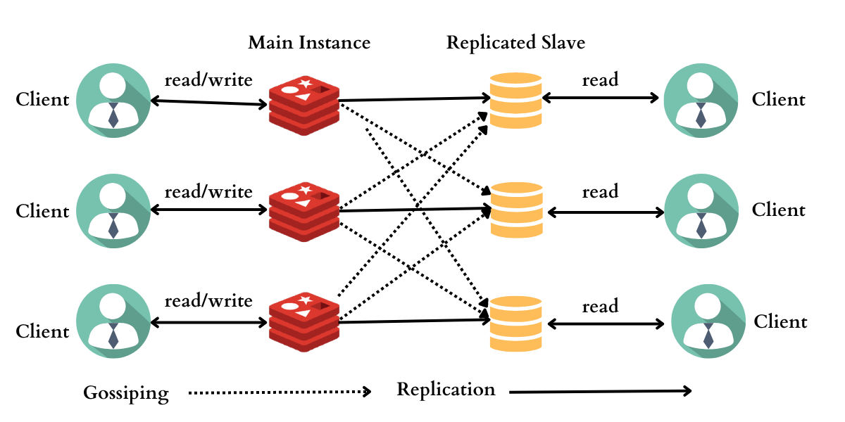 - 마스터-슬레이브 모델을 사용하여 데이터를 여러 Redis 노드로 복사하는 프로세스입니다. 이를 통해 데이터의 내구성을 향상하고, 읽기 쿼리의 성능을 높이며, 시스템의 가용성을 높일 수 있습니다.