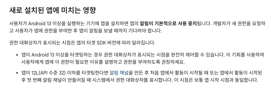 - 우선적으로 안드로이드 13 이상 버전의 경우는 아래의 문서와 같이 알림에 대한 권한이 중지된 상태로 시작이 됩니다. - 즉 안드로이드 12에서는 앱을 설치하면 앱에 대한 알림 권한이 켜진 상태가 되었지만, 안드로이드 13에서는 앱을 설치하여 실행하면 앱에 대한 알림 권한이 꺼진 상태로 시작이 됩니다.