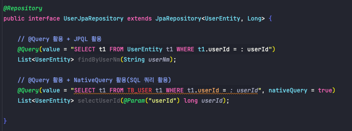 💡 @Query - 개발자가 직접 JPQL(Java Persistence Query Language) 또는 SQL 쿼리를 작성할 수 있게 해 줍니다. 이는 복잡한 쿼리를 수행해야 하는 경우나, Spring Data JPA에서 제공하는 기본 메서드로 처리할 수 없는 상황에서 유용하게 사용됩니다. - @Query 어노테이션은 JpaRepository를 상속받은 인터페이스의 메서드 위에 선언하며, 괄호 안에 직접 쿼리를 작성합니다. - 쿼리를 작성하는 방법에는 JQPL을 이용하거나 SQL문을 사용하는 방법이 있습니다. - JPQL을 사용하는 경우 엔티티 클래스와 그 멤버 변수를 직접 참조하여 쿼리를 작성하며 SQL문으로 사용하려면 @Query 어노테이션에 nativeQuery 속성을 true로 설정하여 작성합니다.