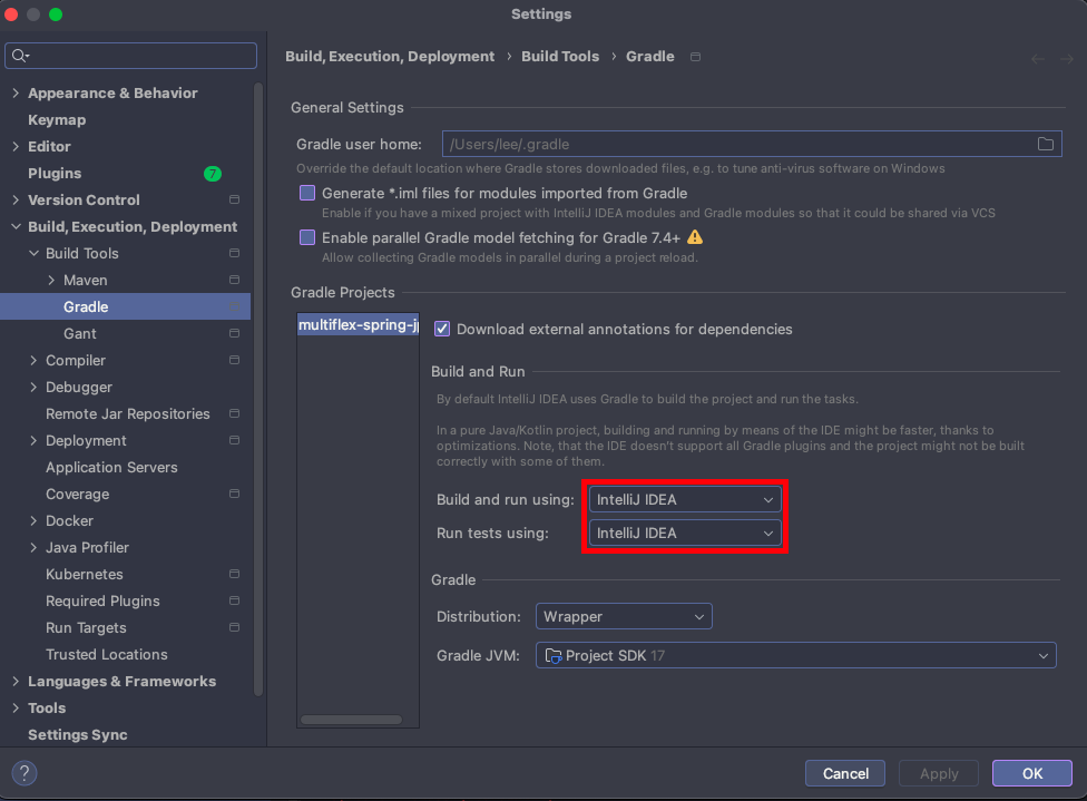 - Build and run using : Gradle에서 IntelliJ IDEA로 변경 - Run and tests using :Gradle에서 IntelliJ IDEA로 변경