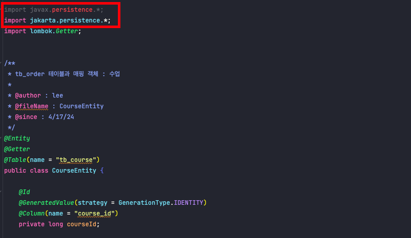 💡 Spring Boot 3.x.x 패키지인 경우 import jakarta.persistence.*; 를 사용하며 import javax.persistence.*; 는 사용되지 않습니다.