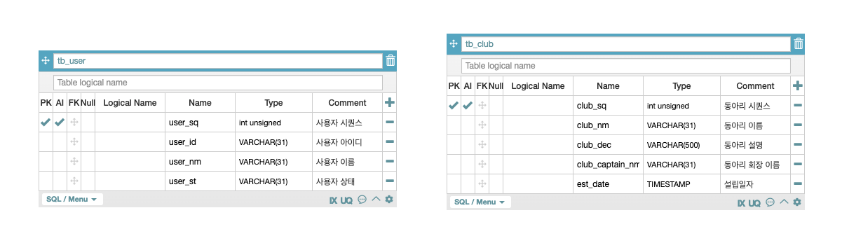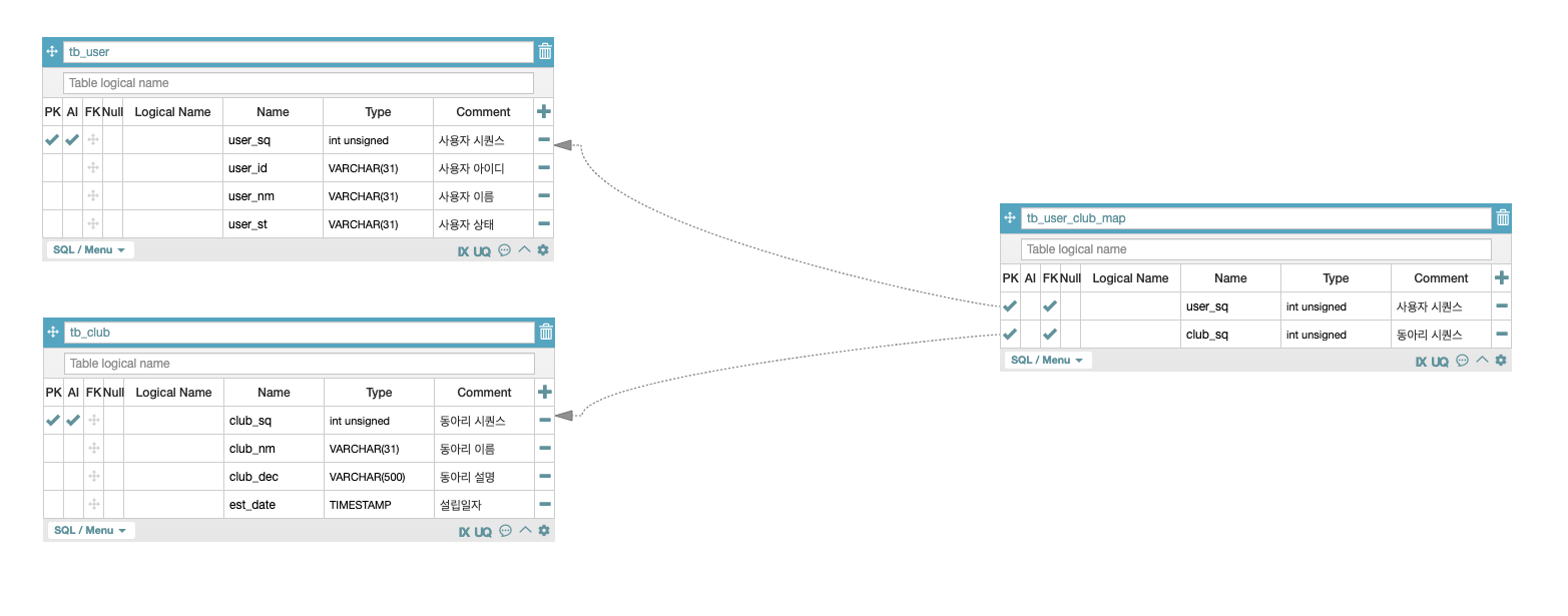 - 해당 테이블의 관계는 사용자(tb_user), 동아리(tb_club)이라는 테이블과 다대다 관계의 형성을 위한 tb_user_club_map이라는 테이블로 구성되어 있습니다. - 사용자가 한 명이거나 여러 명일 수 있고, 가입할 수 있는 동아리는 없거나 1개이거나 많을 수 있기에 해당 구조로 구성되어 있습니다.