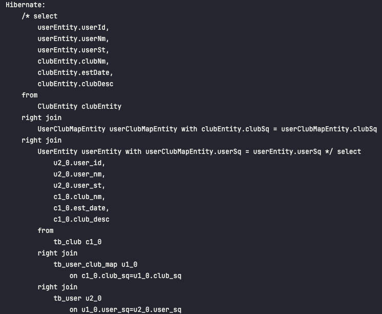 - 위에서 구성한 SQL 사용 예시와 같은 형태로 QueryDSL 내에서 selectUserClubListRight() 메서드에서 구성하였습니다.