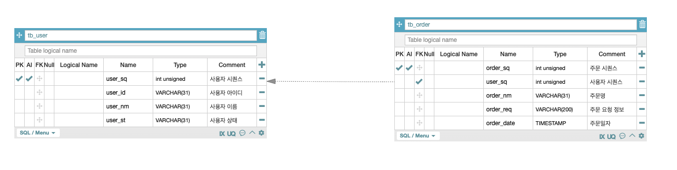 - 사용자(tb_user)는 여러 개의 주문정보(tb_order)를 가지고 있을 수 있기에 1 : N 관계로 구성되어 있습니다.