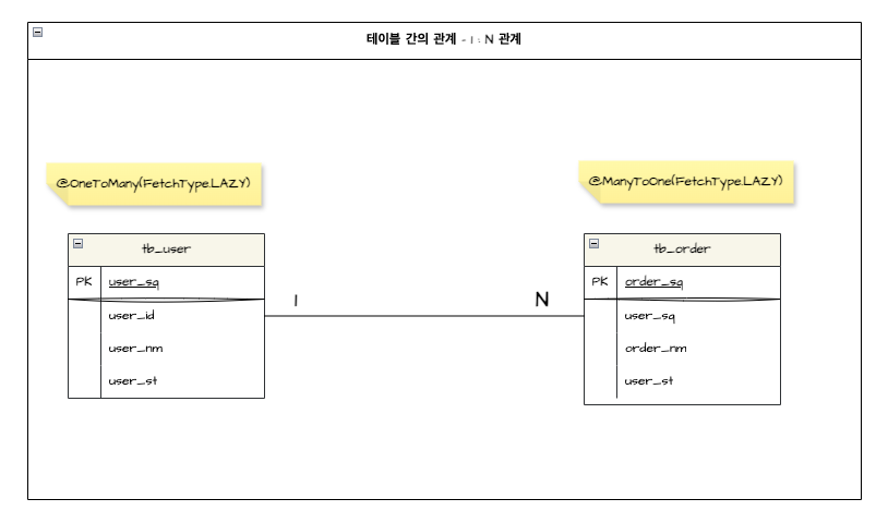 - 사용자 테이블(tb_user)을 기준으로 주문 테이블(tb_order)은 1 : 다 관계입니다. 사용자가 한 명이 있으면 주문 정보는 여러 개가 있기 때문입니다. - 해당 관계에서 사용자 테이블(tb_user)의 엔티티는 주문 테이블(tb_user)의 엔티티와 @OneToMany 관계를 형성 중입니다.