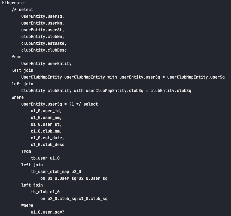 - 위에서 구성한 SQL 사용 예시와 같은 형태로 QueryDSL 내에서 selectUserClubListLeft() 메서드에서 구성하였습니다.
