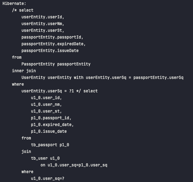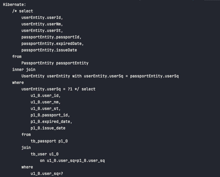 - 위에서 구성한 SQL 사용 예시와 같은 형태로 QueryDSL 내에서 selectUserPassport() 메서드에서 구성하였습니다.