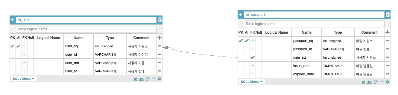 - 사용자(tb_user)는 고유한 하나의 여권(tb_passport)을 가지고 있기에 1:1 관계로 구성이 되어 있습니다.