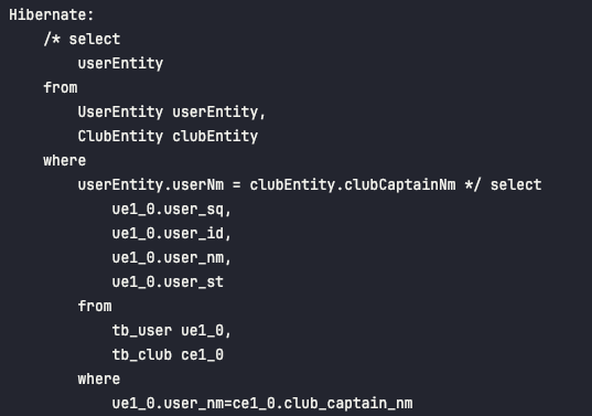 - 위에서 구성한 SQL 사용 예시와 같은 형태로 QueryDSL 내에서 selectUserClubAllList() 메서드에서 구성하였습니다. - 세타 조인을 수행하기 위해서는 from 절 내에 Q-Class를 함께 호출하며 WHERE 조건으로 두 테이블 간을 연결 지을 공통 조건을 주어서 조인을 수행합니다.