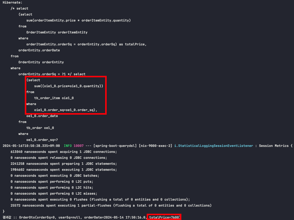 - selectOrderSumItem() 메서드 내에서는 주문에 대한 합계를 구하는 메서드입니다. - 서브쿼리 중 SELECT문에서 스칼라 서브쿼리로 수행이 되는 방법을 알아보기 위한 예시입니다.