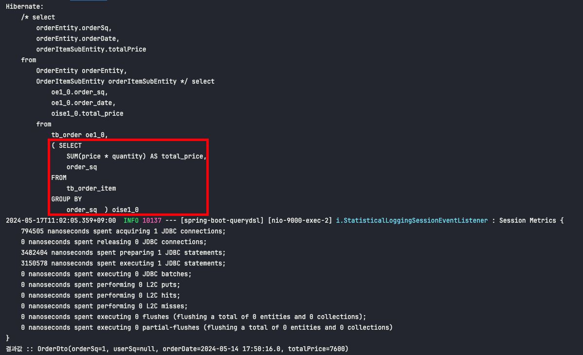 - selectOrderSumItem() 메서드 내에서는 주문에 대한 합계를 구하는 메서드입니다. - 서브쿼리 중 FROM문에서 인라인 뷰로 수행되는 방법을 알아보기 위한 예시입니다. (* 단, QueryDSL 내에서는 FROM 문 내에서는 서브쿼리를 구성할 수 없기에 JOIN문을 활용하여 구성합니다.)