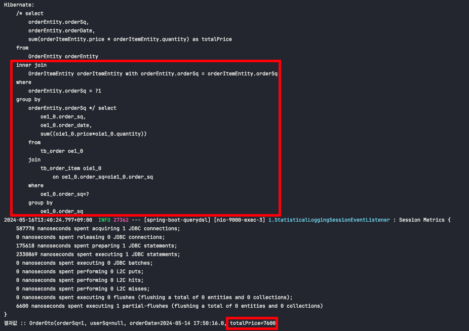 3. JPAExpressions - 실제 서브쿼리를 구성하는 방법입니다. qOrder 엔티티와 qOrderItem 엔티티 간의 관계를 통해서 서브쿼리를 구성하였습니다. - price와 quantity의 곱(multiply)을 수행한 뒤 이 값을 합(sum)을 수행하는 방식으로 서브쿼리가 수행되었습니다.