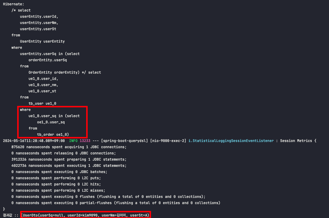 2. JPAExpressions - 실제 서브쿼리를 구성하는 방법입니다. qOrder 엔티티에서 조회되는 userSq를 모두 반환받습니다. - (다건)이 반환되는 값에 따라서 qUser.userSq.in()을 수행하여서 다건에 대한 처리를 수행합니다.