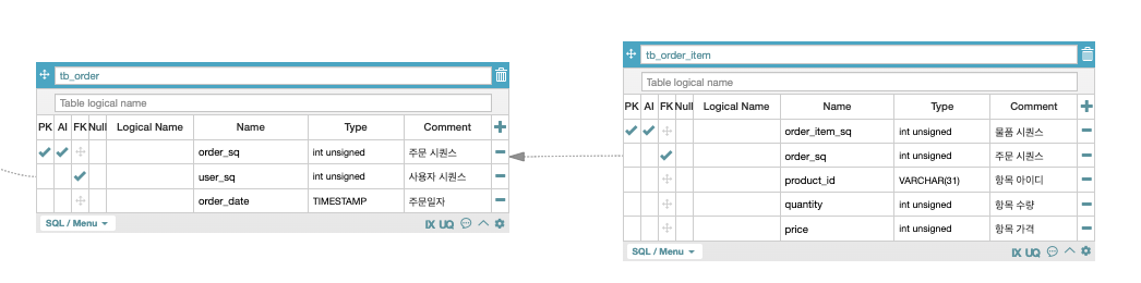 - 주문 테이블(tb_order)과 주문 항목 테이블(tb_order_item)이 존재합니다. - 하나의 주문은 여러 개의 주문 항목정보를 가질 수 있는 1 : N 관계의 구조입니다.