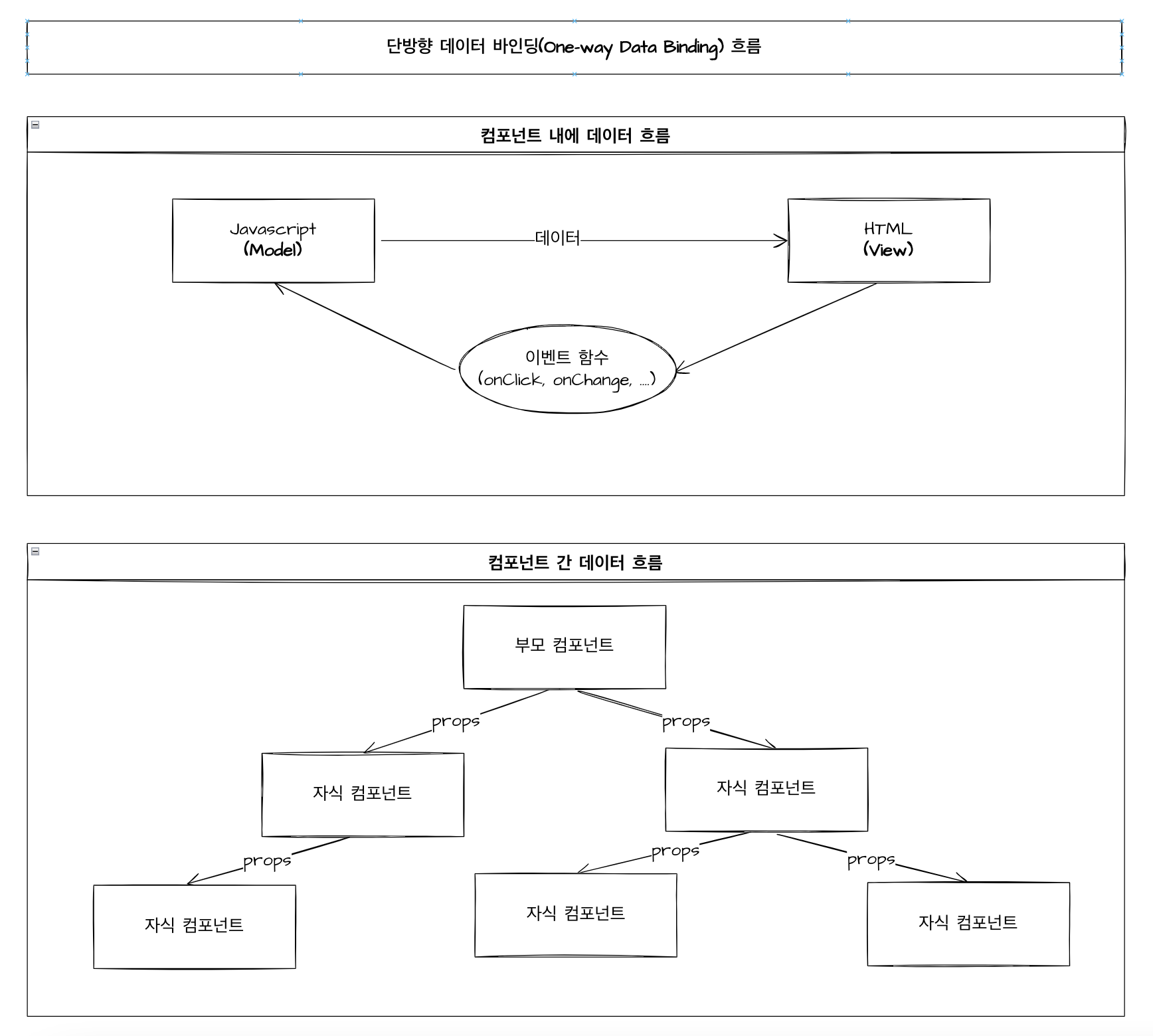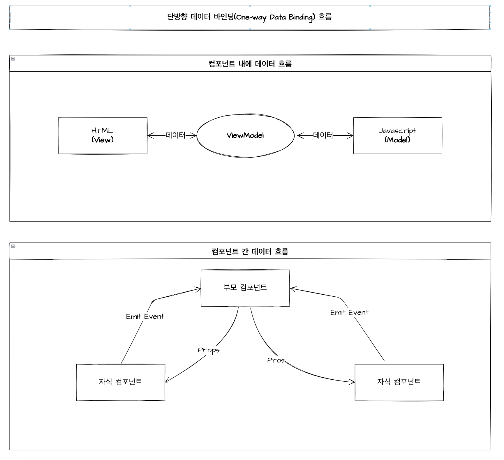 💡 컴포넌트 내에서 '단방향 데이터 바인딩'은 Javascript(Model)에서 HTML(View)로 한 방향으로만 데이터를 동기화하는 것을 의미합니다. [JS(Model) -> HTML(View)]