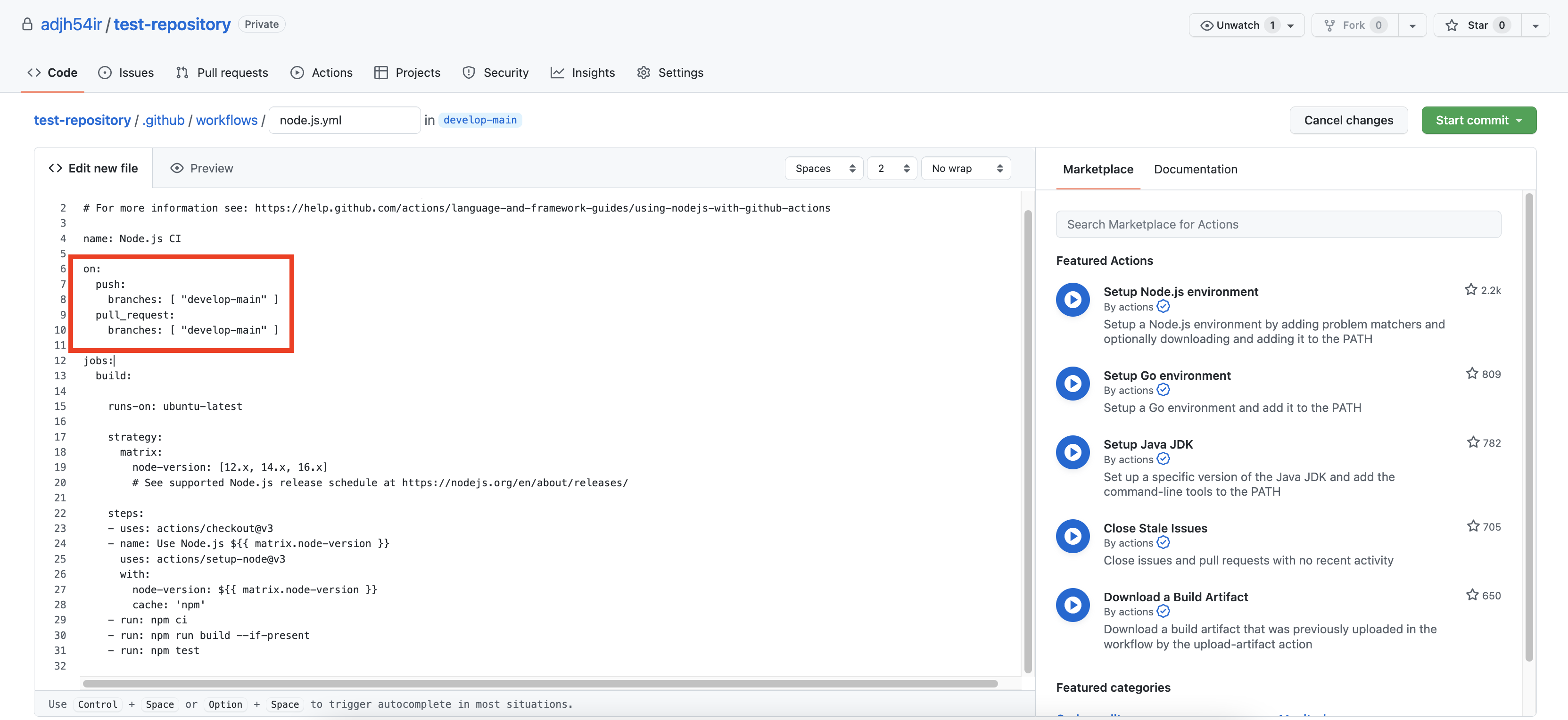 - 아래의 Events의 예시에서는 ‘develop-main’라는 메인 브런치에 'push' 혹은 'pull request'가 발생 시 해당 workflow가 수행된다는 것을 의미하는 예시입니다.
