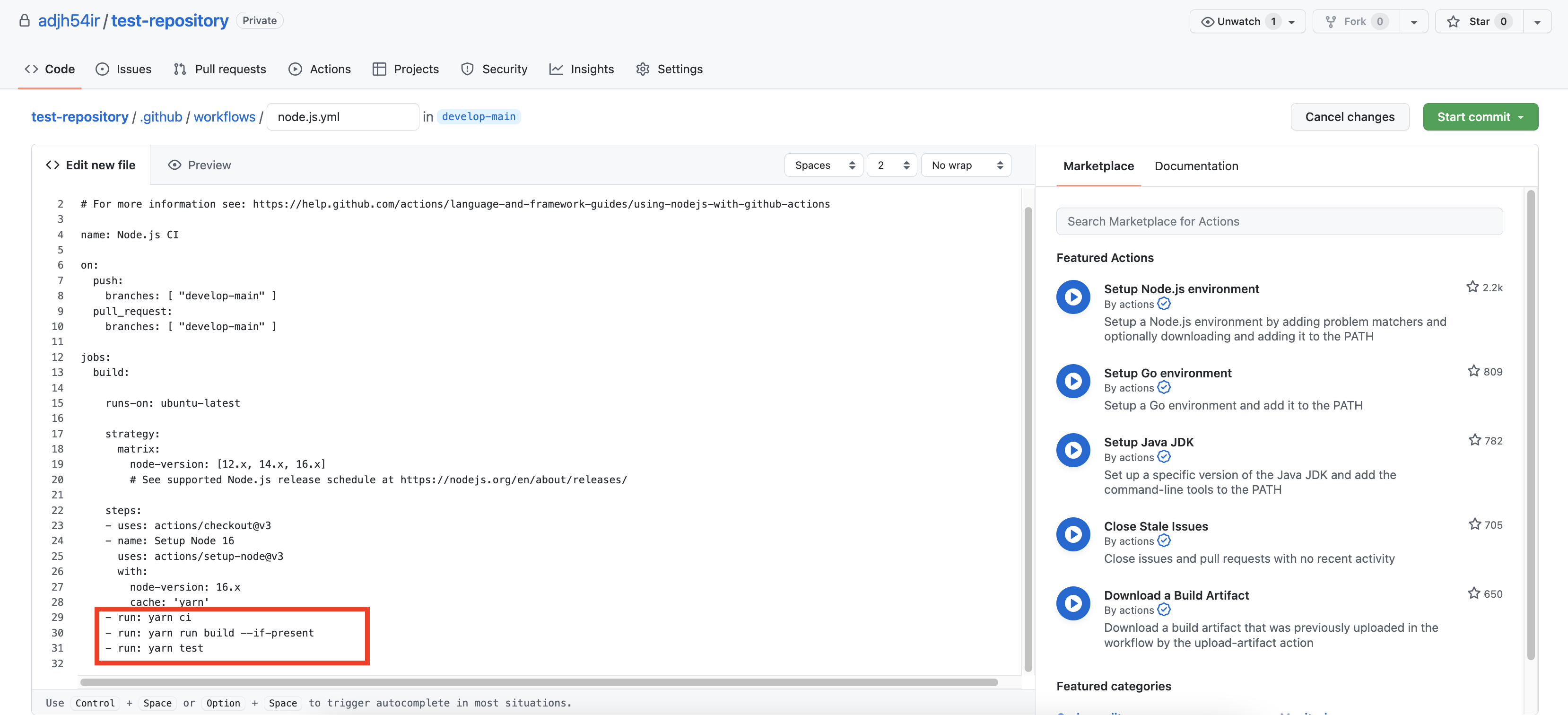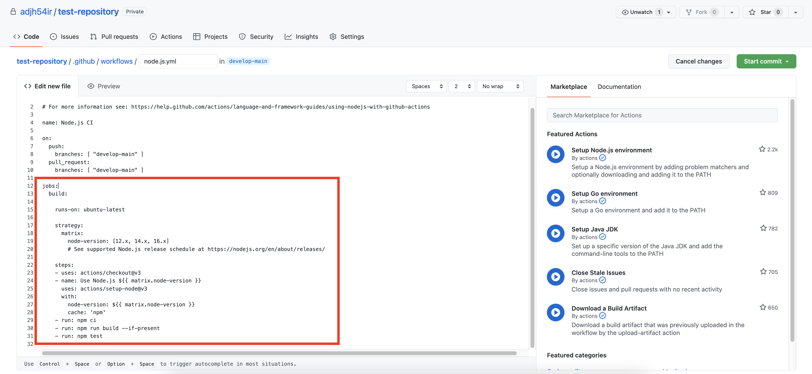 - 아래의 예시에서는 하나의 Job이 빌드가 되고 'strategy'에서는 각각 지정한 Node 버전(12.x, 14.x, 16.x)에 대해서 수행을 하겠다고 하는 것을 정의 한 부분입니다. (기본적으로 템플릿을 만들 때 추가가 되었으나 잘 사용하지 않는다고 합니다.)