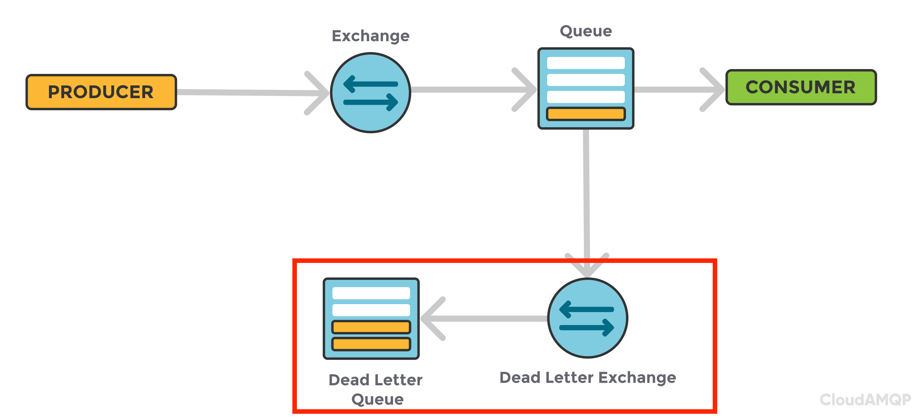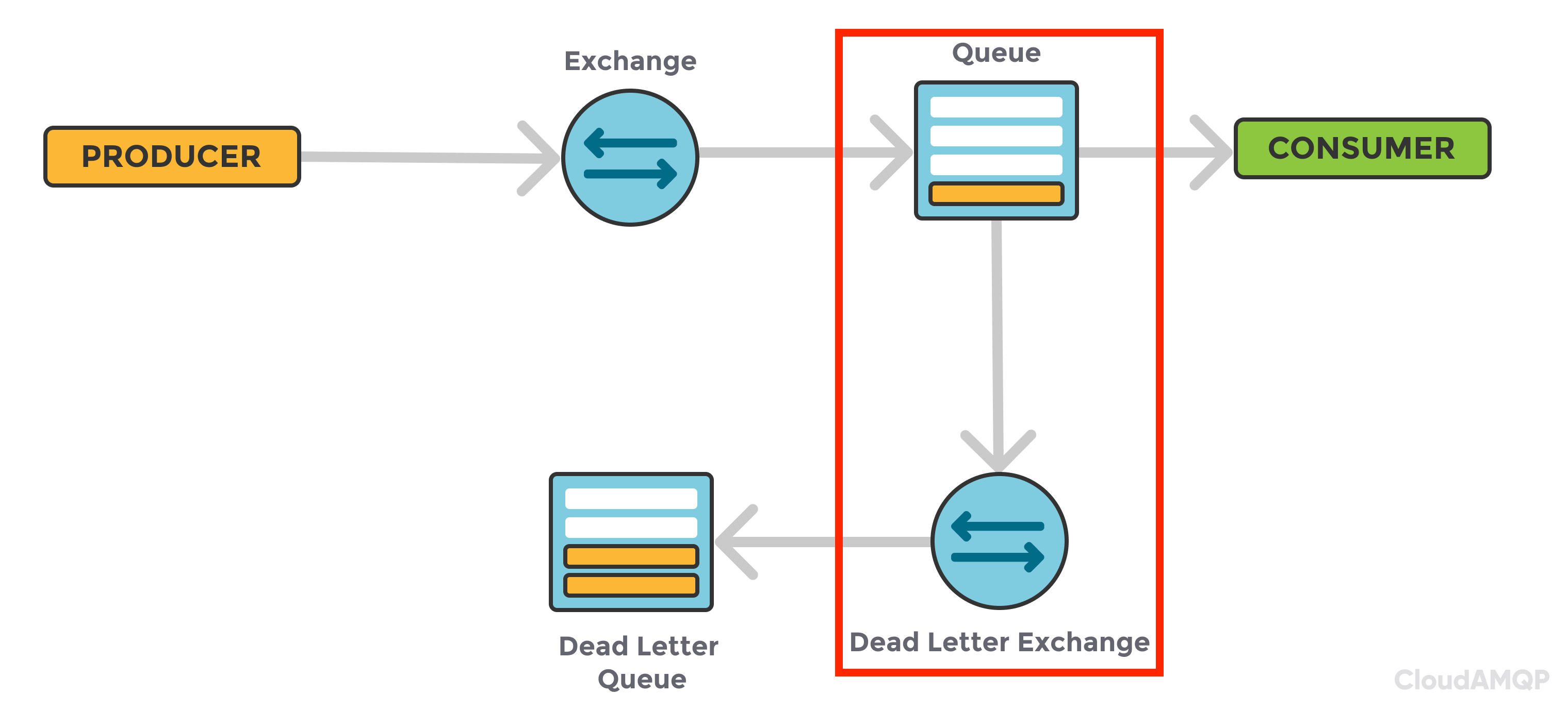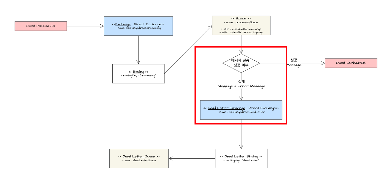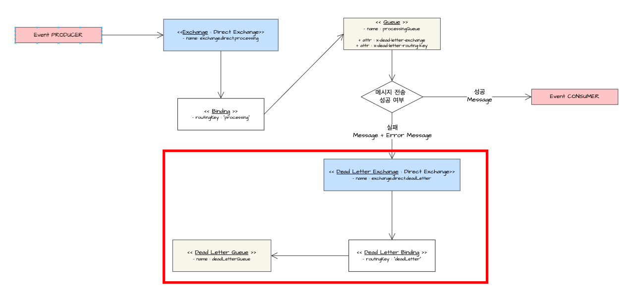 - 이벤트 생성자가 이벤트 소비자에게 전달하기 위해 큐를 구성하였을 때, 이 큐 내에서는 속성 값으로 x-dead-letter-exchange, x-dead-letter-routing-key를 지정하여서, 메시지 전송 실패 시 Dead Letter Exchange로 라우팅 되도록 처리를 합니다. - 해당 익스체인지 내에서는 Dead Letter Queue 내에서 실패 메시지가 적재되도록 라우팅 하는 역할을 수행합니다.