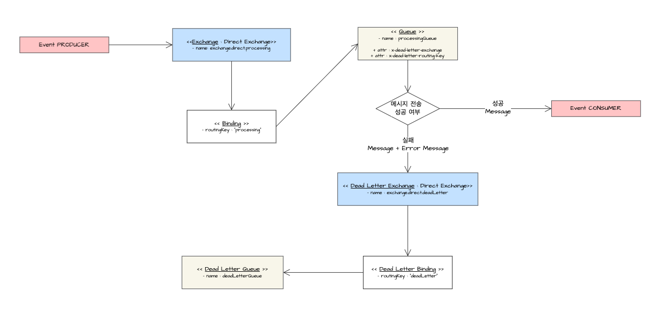 - Direct Exchange 구성 : Dead Letter Exchange로 라우팅을 하는 데 사용 - 성공적으로 처리하지 못한 메시지를 메시지 큐(deadLetterQueue)로 전달하는 역할을 수행합니다.